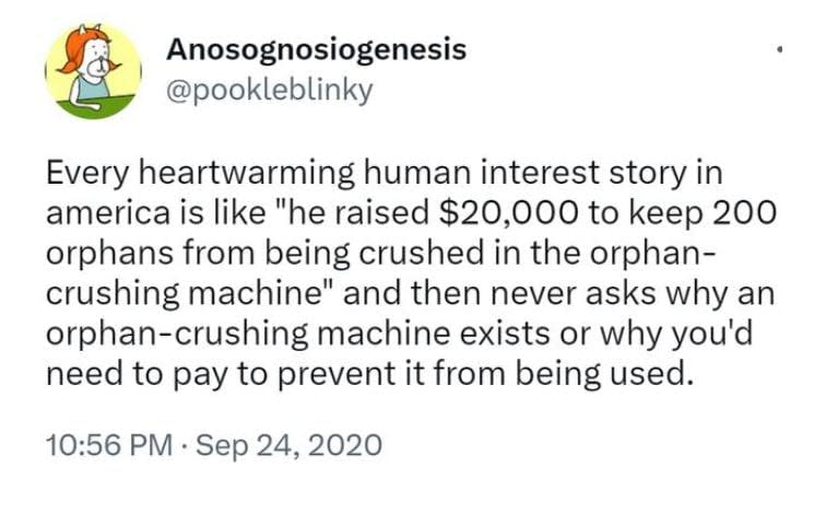 Our orphan crushing machine has a great big loudspeaker and an endlessly looping soundtrack that blares to all and sundry that 100% of the people being crushed beneath it deserve their fate because they did not try hard enough to avoid being crushed. It's kind of loud and annoying but the machine plays it constantly for image management. If the members of a society ever realized that being crushed under the indifferent and inexorable treads of the orphan crushing machine could happen to anyone, and not just to the "deserving few" who brought it upon themselves, then then the society as a whole might feel moved to do something about the orphan crushing machine's ongoing existence. But, with continual image management, instead of people being horrified that orphans are being crushed, they say things like... "Our orphan crushing machine is OK. It's one of the good ones, not like the ones they have over in Scapegoat Foreign Country. OUR orphan crushing machine only crushes the orphans who deserve to be crushed. Lots of orphans are not crushed by our orphan crushing machine. Heck, just last week an exceptional orphan got a scholarship to The Fancy University, so it's totally #notallorphans."