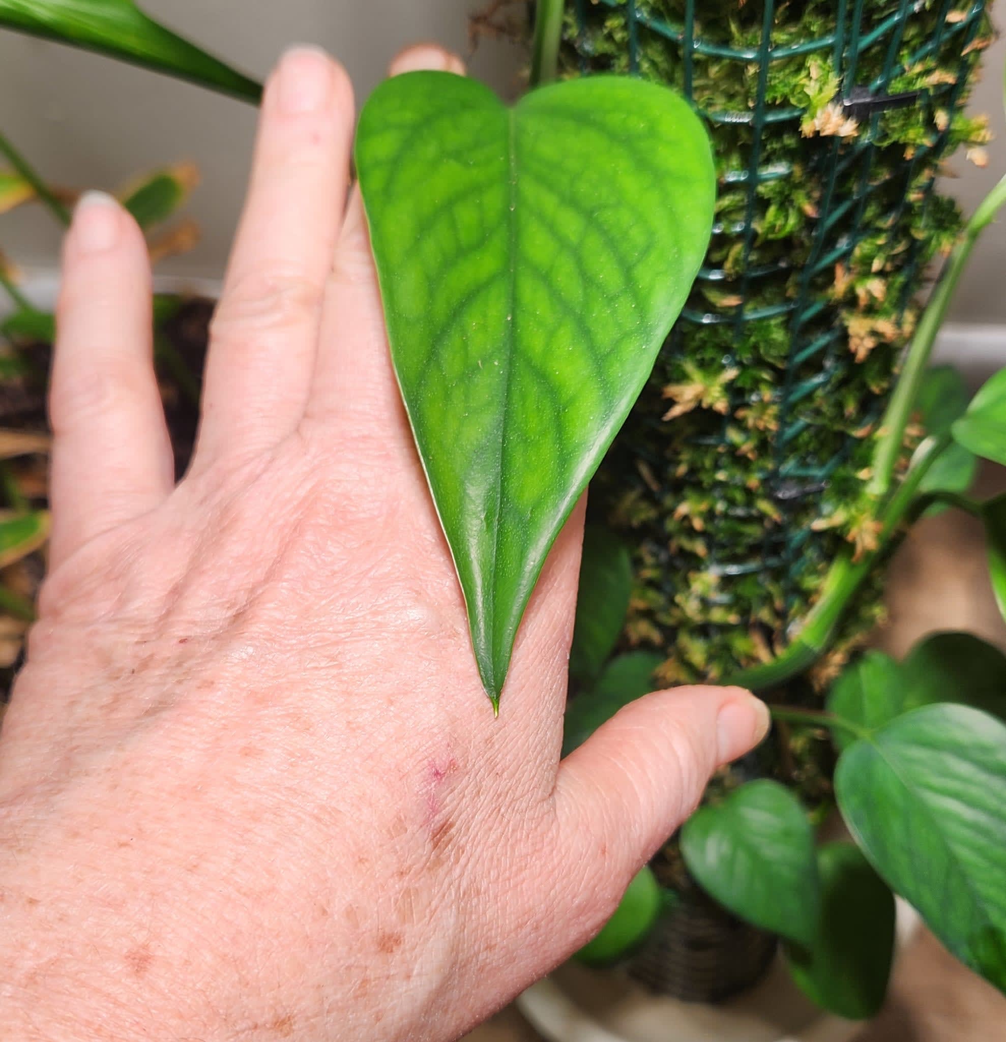 The pothos project is going along nicely. I'm starting to see some actual changes in the plant now that it's several leaf nodes up the pole. (And cut off from the starter plant, like, all it is growing from now is the moss pole. There's not even any dirt.)