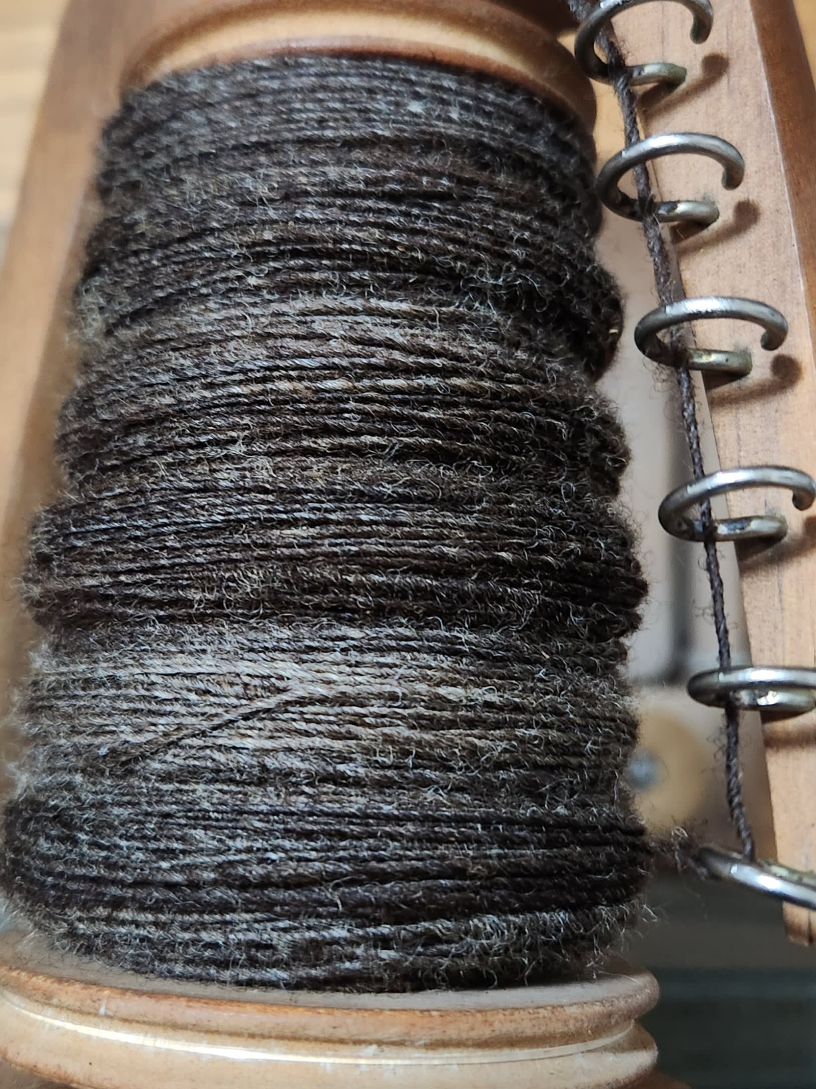 Here's the pre-plying bobbin, which is spun in the grease. After this picture, I plied it with the white two ply that I didn't like, niddy-noddy'd it up into a hank, tied it off, washed it and rinsed 3x, hung it to dry, and then wound it on my ball winder. It's in center pull balls, ready to go at this point. I did not get a picture of the finished product because I was having Big Feelings about the purple yarn and not doing my best documenting.