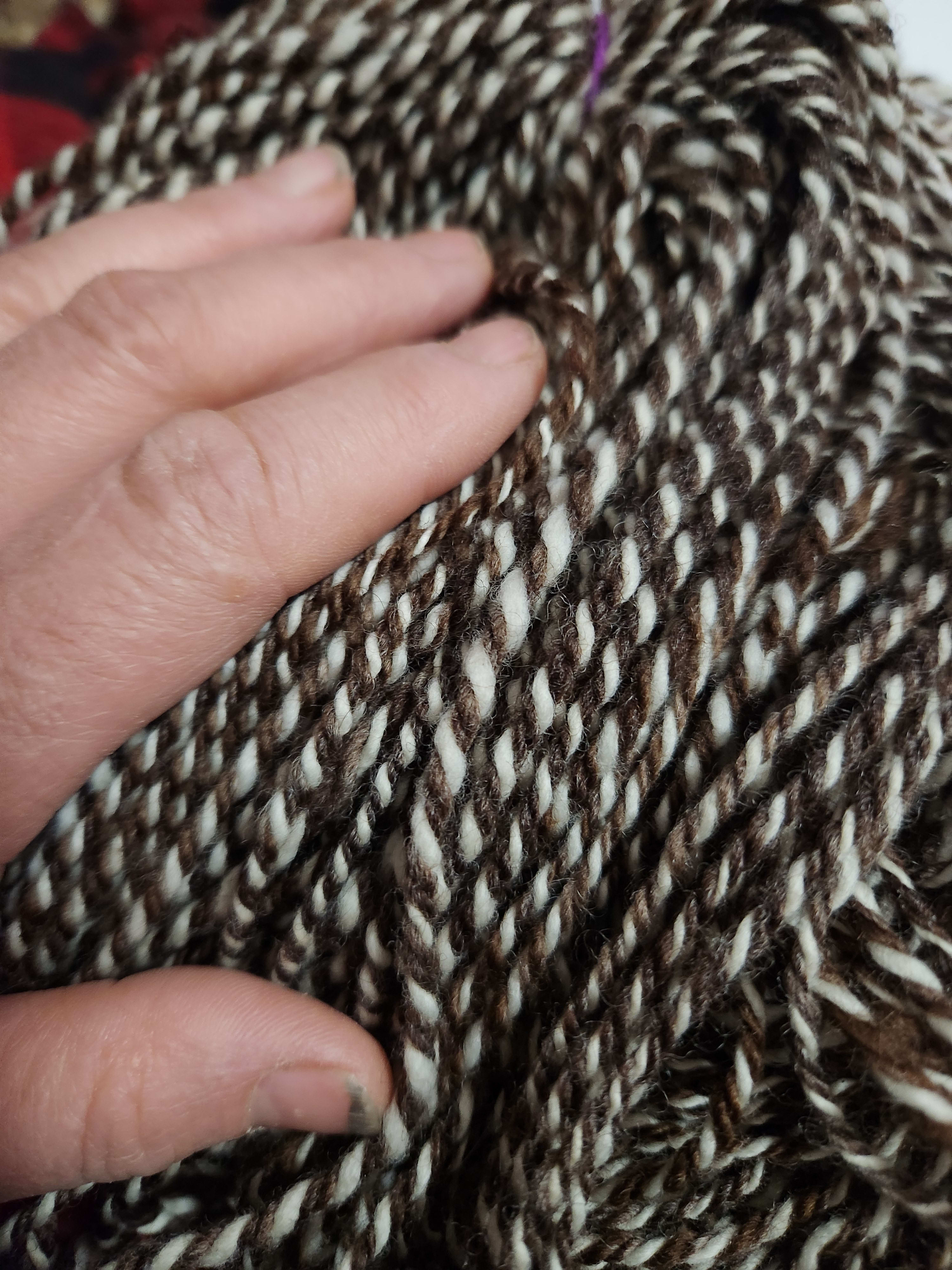 Sheep 1 is the brown 2 ply handspun that I didn't make but inherited. (It is also limp, new-spinner yarn. Usable but not amazing.)