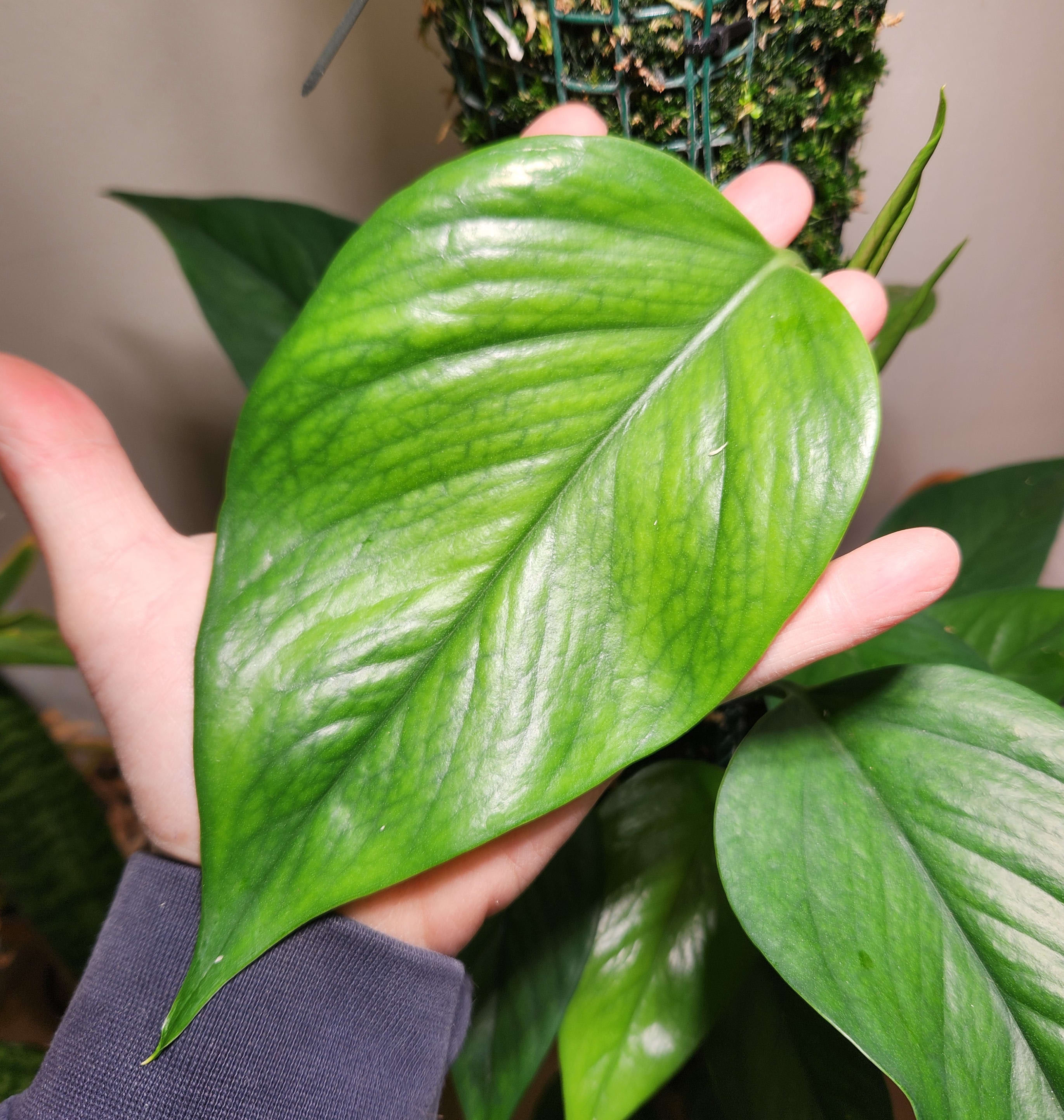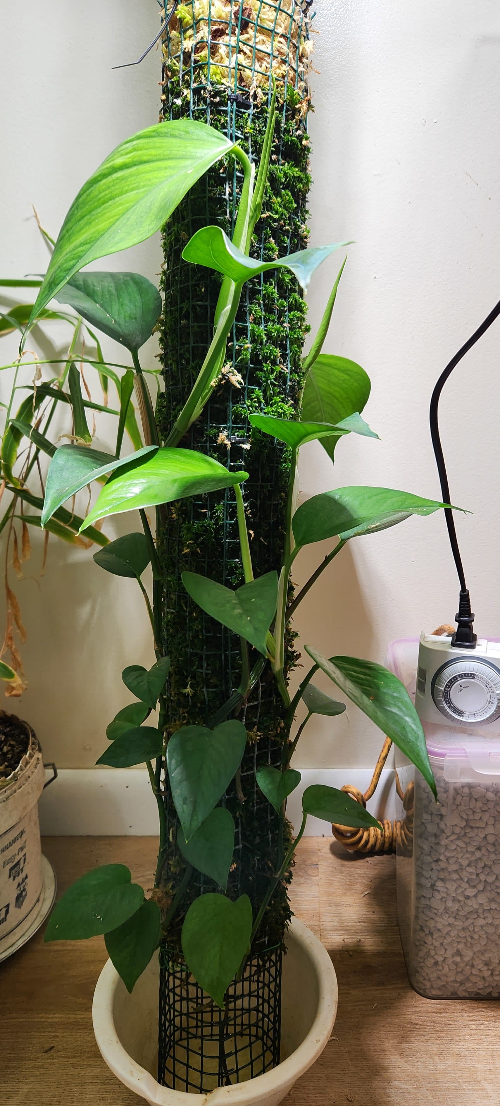 In order to deceive the pothos into thinking that it is continually approaching the sun through rainforest canopy in the tropics instead of growing towards a lightbulb in my plant room in Pennsylvania, I am deploying a one-potato, two-potato, three-potato, four approach to the moss poles. (I did not invent this strategy, I stole it from plant youtuber Sydney Plant Guy.) Shortly before the pothos arrives at the top of the moss pole, I put a new moss pole on top of the existing setup. I wait for plant to grow onto new moss pole and establish roots... remove lower moss pole and attached pothos, refresh moss pole, and put the refreshed moss pole on top of old 'upper' moss pole, so that former upper moss pole becomes new lower moss pole and the pothos has more room to grow upward. The chopped off pothos could be retained but I don't need another one so it becomes compost.